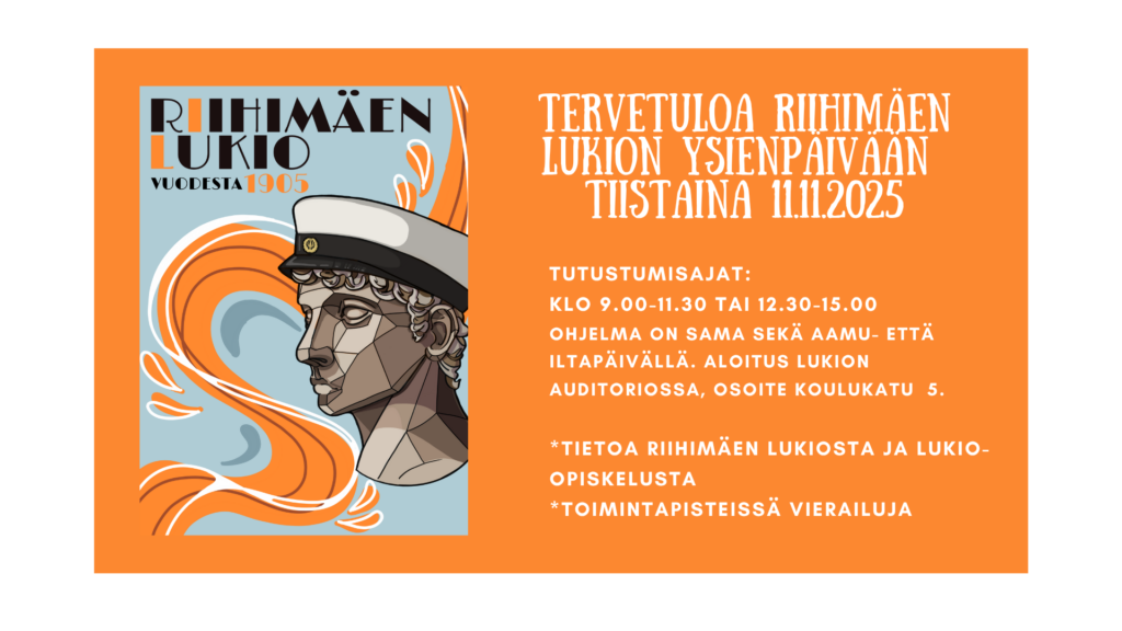 Tervetuloa Riihimäen lukion ysienpäivään tiistaina 11.11.2025. Tutustumisajat: klo 9.00-11.30 tai 12.30-15.00. Ohjelma on sama sekä aamu- että iltapäivällä. Aloitus lukion auditoriossa, osoite Koulukatu 5.
